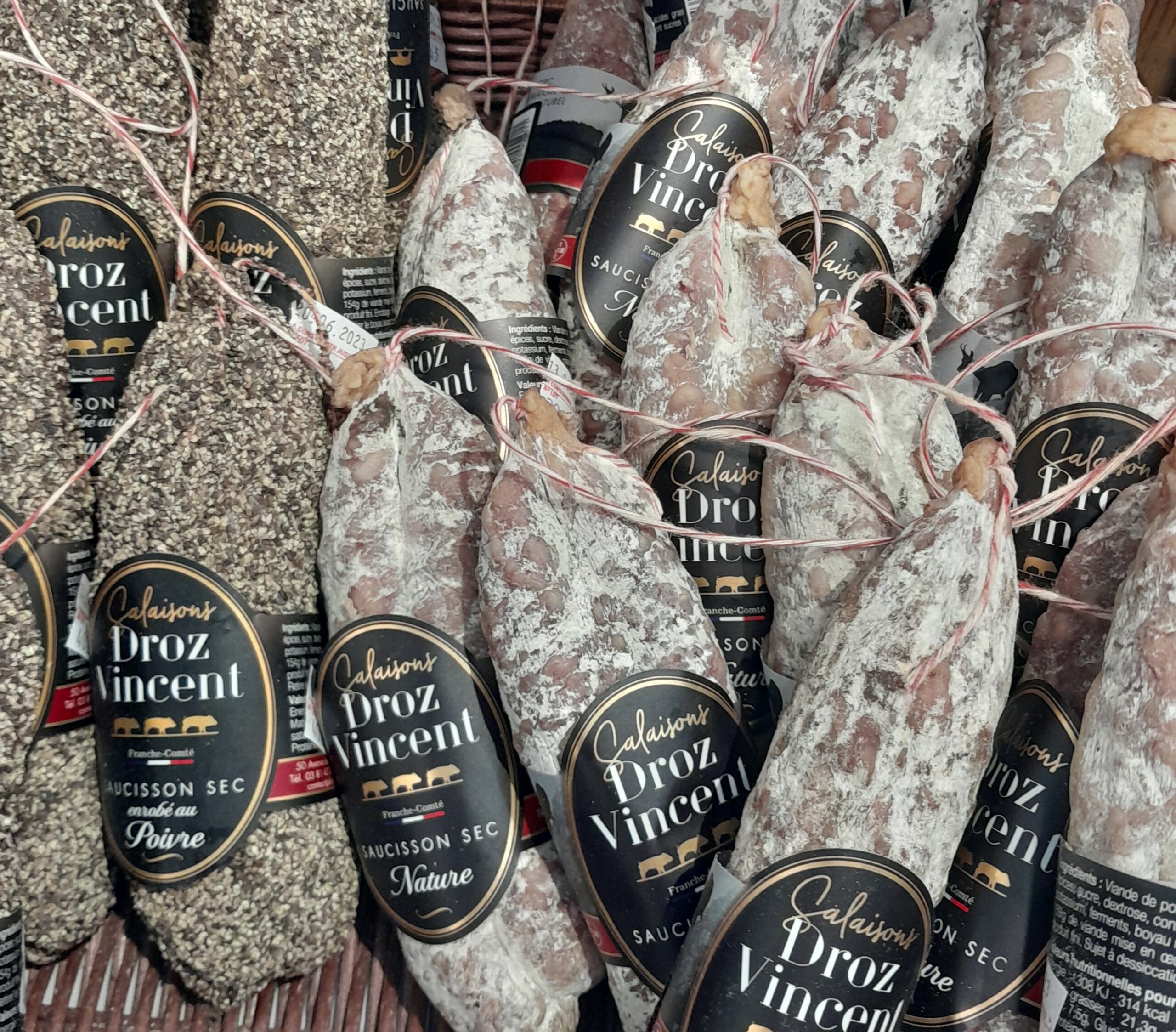 Les Salaisons Droz de Gilley pour les saucissons, coppa, palette fumée, jésus pistaché, diverses terrines et Saucisses de Morteau au cumin, au Comté et sans additif.